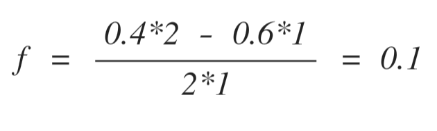 승리했을 때 배팅한 돈을 3배로 돌려주므로 수익률은 200%니까 W = 2, 패배했을 때 배팅한 돈 전부를 잃게 되므로 손실률은 100%니까 L = 1이다. 따라서, 도박사의 수익을 극대화하는 배팅 비율 f는