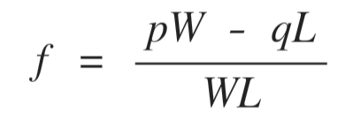 배팅을 할 때 수익을 극대화시켜주는 배팅 비율인 캘리 비율 f는 아래와 같다.