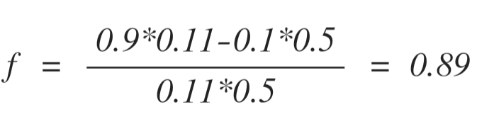 그리고 도박사들은 일반적으로 승리하였을 때는 11%의 수익을 얻고, 실패하였을 때는 50%의 손실을 입었다. 따라서 승리하였을 때 수익률 W = 0.11, 실패하였을 때 손실률 L = 0.5라고 추정하였다.