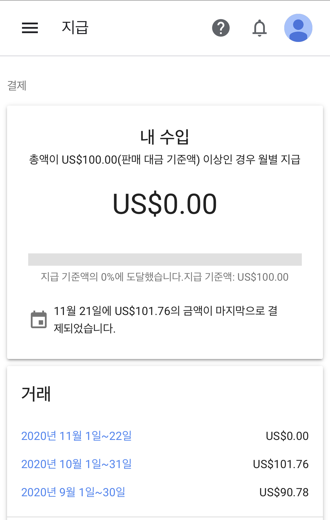 애드센스를 시작한 지 1년 여가 지나 드디어 지급 가능한 수익 100달러를 채웠다. 2020년 10월까지 모은 수익이 빠듯하게 100달러를 넘겼고, 입금이 될 때만을 기다리고 있었다.