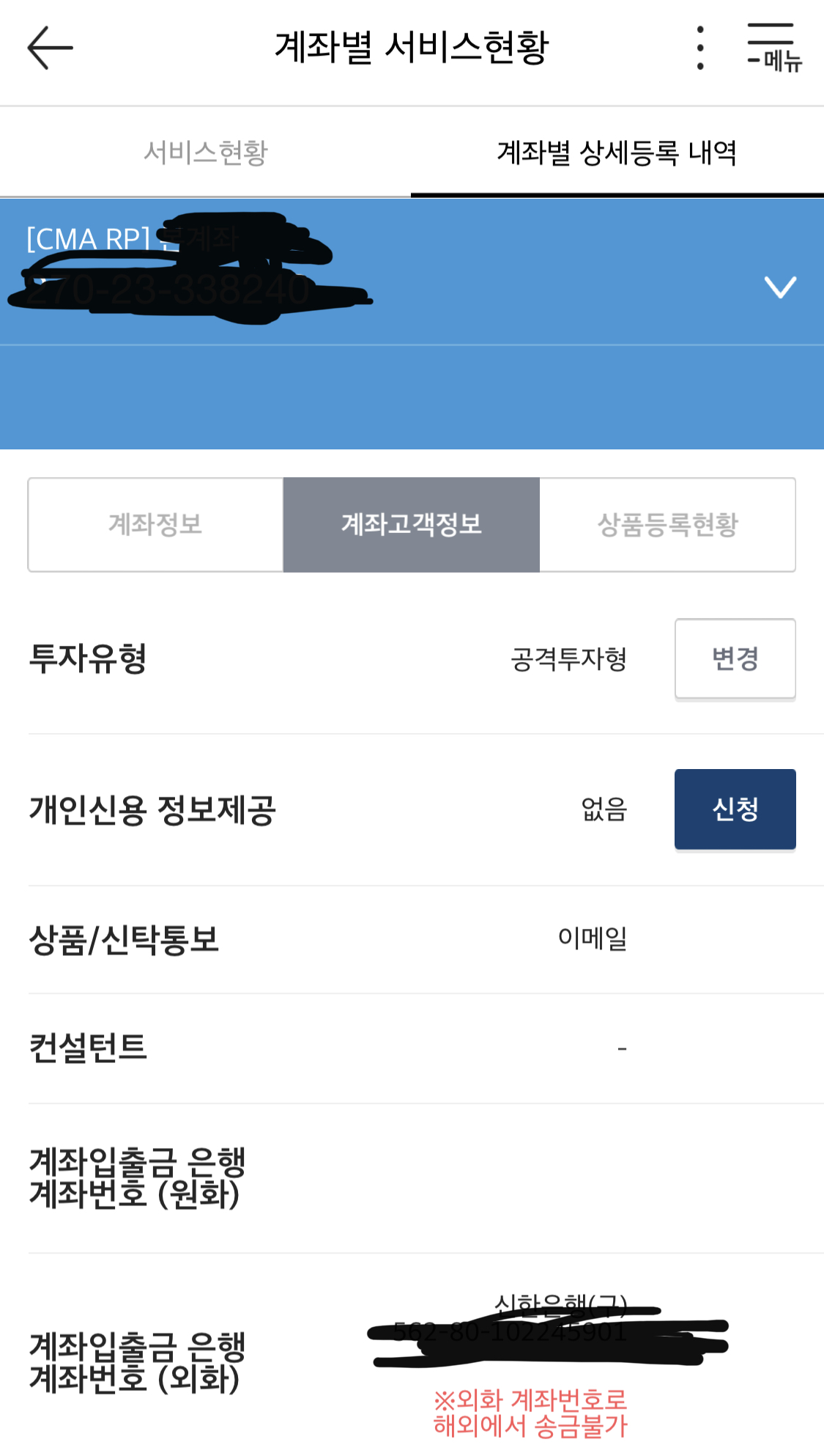 위의 사진에서처럼 신한금융투자 앱에서 모바일 지점-고객정보관리-계좌별 서비스 현황 메뉴로 들어간다. 그리고 거기서 '계좌고객정보'로 들어가면 아래에 외화를 송금할 수 있는 신한은행의 계좌번호가 나온다.