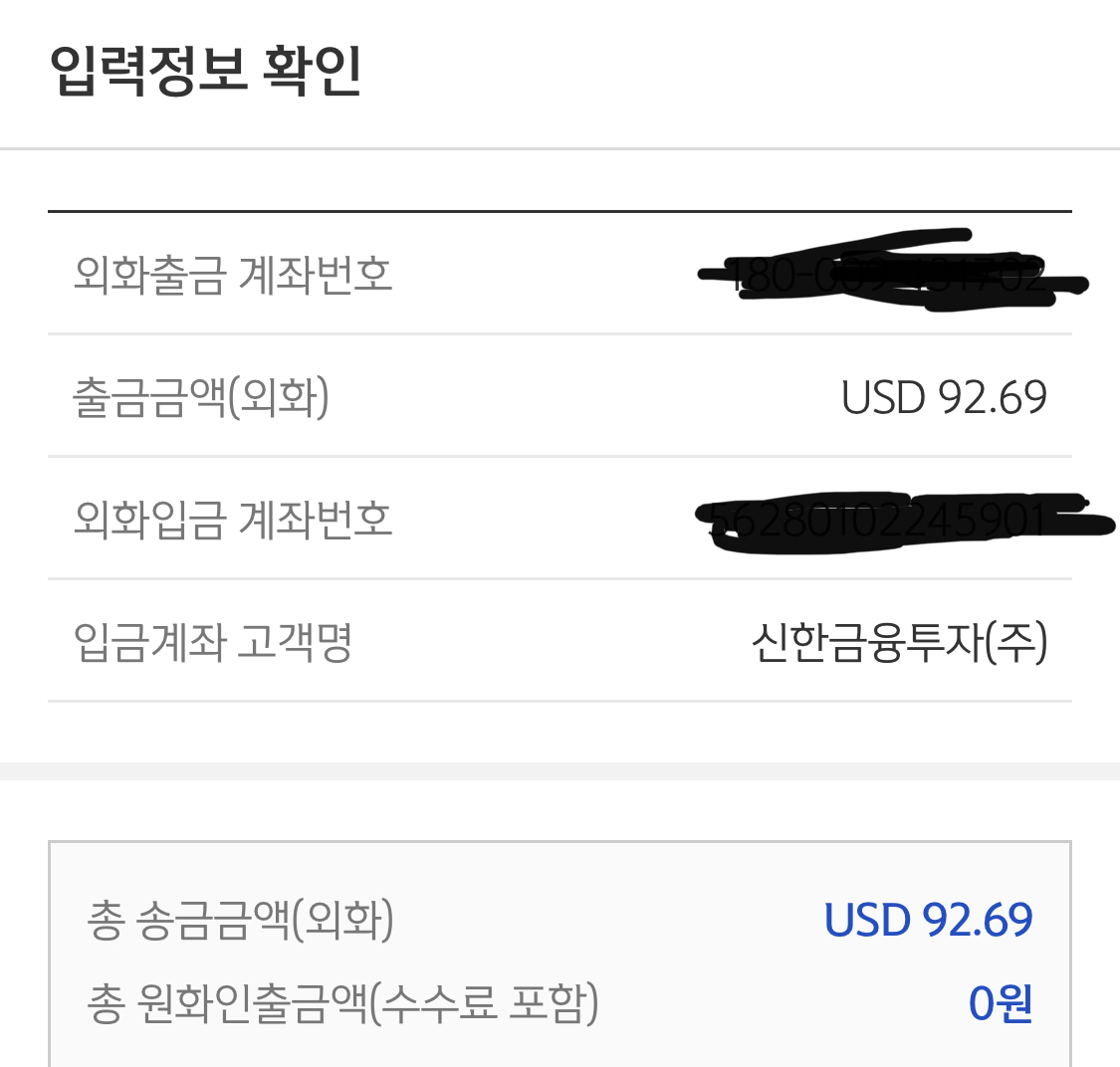 그리고 신한은행 외화체인지업 계좌에서 위에서 확인한 신한금융투자의 외화 계좌로 송금하는 것은, 당행이체로 처리되기 때문에 위와 같이 수수료가 무료다.