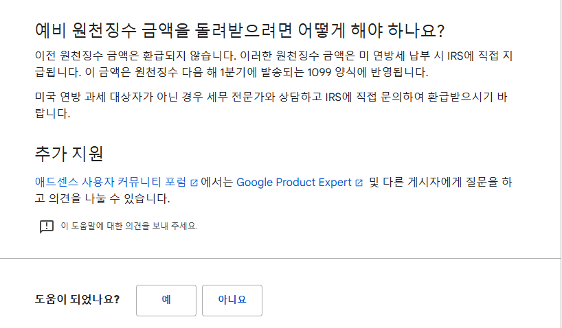 구글은 애드센스 수익에서 24%를 원천징수 후에 바로 그 금액을 미국의 국세청인 IRS에 납부해 버린다. 그래서 구글에 그 돈을 돌려달라고 할 수는 없다.