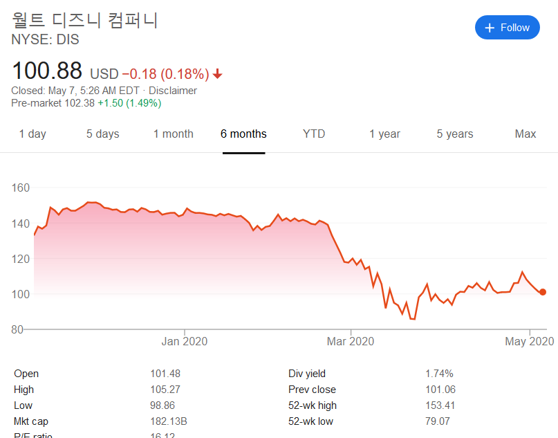 대략 1.5%의 가량의 수익을 올려주던 배당 수익이 반토막난 것은 둘째 치고, 주가의 회복이 지지부진하다. 대형 테크주를 중심으로 코로나 사태를 이겨내고(혹은 FED의 무한 돈 찍어내기 덕분에) 주가의 회복이 완연한 가운데 디즈니는 여전히 그 충격에서 헤어 나오지 못하고 있다.